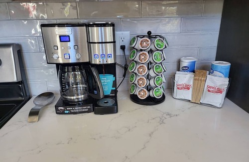 Fully equipped kitchen including pots, pans, toaster, crockpot, utensils, dinnerware, and coffee station.