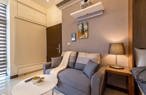 Experience a comfortable and convenient stay at this chic 1BR open space apartment, with a fully equipped kitchen, dining area, projector cinema, bathtub, and designated workspace. Only 1.5 min from Taipei City Hall MRT, your Taipei getaway awaits.