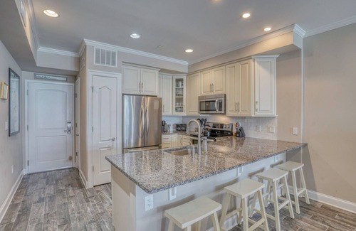 This modern two bedroom, two bath, condominium sleeps 6 comfortably. The spacious first bedroom features a king-sized bed with ensuite bathroom, access to the balcony, and flat-screen TV. The second bedroom offers a queen bed and access to the full hall bathroom. A washer and dryer are adjacent to the second bathroom.