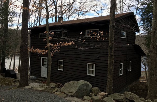 construction. The cabin is located on a slope under a canopy of mature beech, maple and oak hardwood trees, affording shade and wonderful views of Lake Wallenpaupack, located only 200’ from the front door.