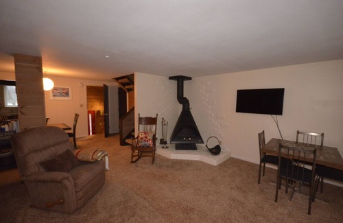 The kitchen and living space are on the main level. Two bedrooms are upstairs and two are downstairs in the walk-out basement. All of the bedrooms have connected bathrooms. The main floor has a living room/dining room combo with a small, but full, kitchen. There is a wood-burning fireplace for those chilly nights. On the deck off the living room, you can relax and watch the sun go down. There are wall-unit air conditioners throughout the townhouse.