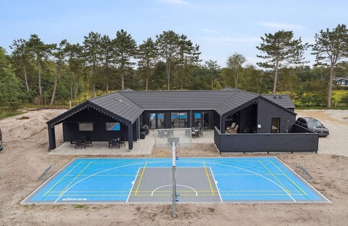 Welcome to a modern Admiral Strand holiday home near the Lolland coast Imagine a holiday where peace settles in, nature is right outside your door, and both children and adults have space to relax and enjoy time together. Just 200 metres from one of Lolland’s peaceful beaches lies this spacious and well-appointed holiday home – ideal for a large family or group of friends who want to spend time together in beautiful, tranquil surroundings. Outdoor living with space for everyone The house offers a large, partially covered terrace – the perfect spot for morning coffee, shared meals, and long summer evenings under the open sky. Children can have fun on the trampoline and in the play tower, while the adults enjoy a glass of wine and the view of the green surroundings. For the active, there are outdoor multi-sports courts where you can play everything from football and beach volleyball to basketball and badminton. Wellness and water fun – all year round Indoors, you will find an inviting pool area with a 20 m² swimming pool, water slide, and a built-in swimming trainer. When it’s time to recharge, you can indulge yourself in the outdoor spa or relax in the sauna – whatever the season. Everything here is designed for a true holiday atmosphere and well-being. Cozy moments, togetherness, and entertainment The holiday home features a large activity room where you can gather for games and laughter. Here you’ll find billiards, table tennis, darts, and table football – and for more relaxed moments, there’s a sofa area with a TV and game console. The house also has its own bar, where you can enjoy cold drinks and cozy evenings in good company. Room for community and privacy With eight bright bedrooms and four additional sleeping spaces in the loft, there’s plenty of room for up to 20 people. Four bathrooms make it easy for many guests to stay together without compromising on comfort. The open and functional XL kitchen makes cooking a shared experience, with everything you need: two ovens, two dishwashers, two refrigerators, and a long dining table for everyone. Modern facilities and true holiday home atmosphere The holiday home is equipped with modern AV solutions, including Sonos speakers in the common areas and a projector with a 120" screen – ideal for both movie nights and presentations. This makes the house suitable not only for holidays and celebrations but also for small company events and teambuilding in a relaxed setting. This Admiral Strand holiday home is more than just a place to stay – it’s a base for shared experiences, closeness, and great memories. Whether you’re planning a multi-generation holiday, a birthday weekend, or a relaxing getaway with friends, comfort, functionality, and atmosphere have all been taken into account. Book your stay today – and look forward to a holiday in beautiful, nature-filled surroundings on Lolland.