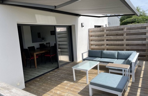 Terrace: wooden terrace, garden furniture 6 people max., small lawn garden with BBQ WEBER