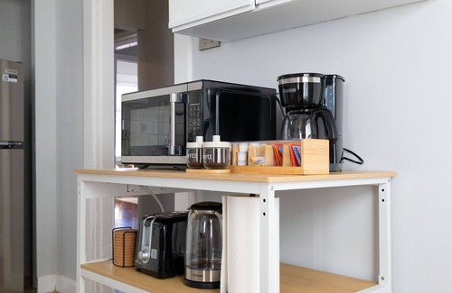 - Fully equipped kitchen with pots/pans, toaster, microwave, oven, coffee machine, coffee, kitchen knives, bakeware, dinnerware, coffee mugs, wine glasses, cooking utensils, kettle, tea, basic condiments, and more!