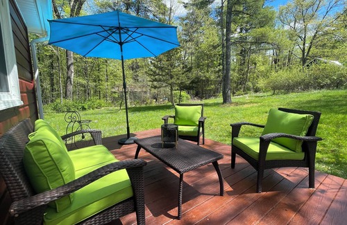We invite you to enjoy your time upstate in our Cozy Red Woodstock Cottage! This adorable, thoughtfully renovated 2 BR cottage was originally built in 1935 is only a short 12 min walk to the heart of Woodstock Village. Walk into a light and spacious open plan dining/living room with dark wood beams and accents, skylights and large windows allowing the nature outside to surround you while you relax. Outfitted with large antique dining table that seats 4 as well as a 60” TV and Sonos sound system for nights and days in. Large, separate eat-inkitchen w/ breakfast bar and paned windows that open to the screened-in porch and brand new stainless steel appliances. Treat yourself to your own spa experience by taking a bath in the newly refinished antique deep claw foot tub. The second floor has a cozy TV room, loft work space with reading nook. Enjoy morning coffee or evening cocktails with friends on the screened porch or from the outdoor seating area on the wood deck. Candles and LED solar string lights give you a soft glow at night. Take a nap in the hammock and watch the deer graze on the adjacent field. Private and quiet oasis surrounded by green yet only minutes to the heart of Woodstock, great restaurants, shops and the activities of our quaint, historic town at the gateway of the Catskills. Come and experience it with us!