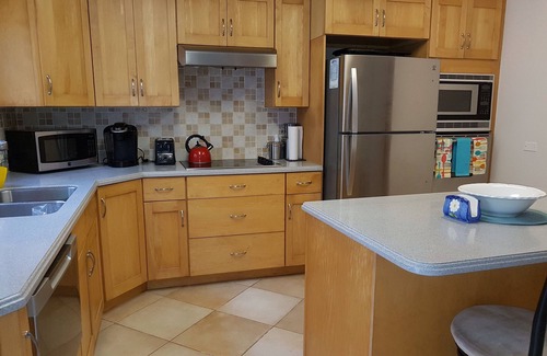 The 1,500 square foot unit is fully furnished and has air conditioning throughout. There is tile in the kitchen and bathrooms and new flooring throughout the rest of the unit. There are walk-in closets, ample storage space, laundry facilities and a half bath on the ground level. The unit also comes equipped with internet and wifi, cable television, a telephone land line, towels and linen, iron and ironing board and parking. A large lawn and private patio are also available equipped with barbecue, outdoor table and chairs.