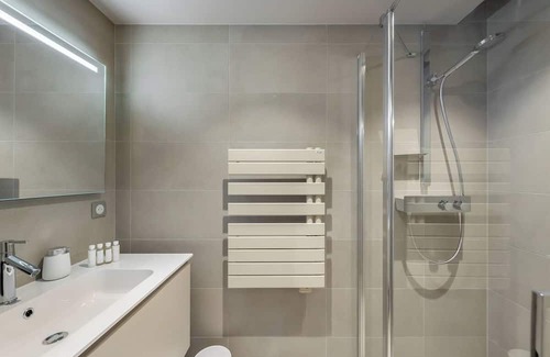 The apartment boasts two delightful bedrooms, each of which has been thoughtfully designed to ensure a restful night's sleep. The double bedroom features relaxed, understated décor and a private balcony, ideal for a romantic glass of wine under the stars. The second bedroom makes a great family room or a cosy sleepover haven for three younger visitors, with a single bed and a set of bunk beds. This bedroom features a modern en-suite bathroom with a walk-in shower, while the apartment also offers an independent family bathroom with a bathtub and convenient laundry facilities. After a day on the slopes, head to the residence's fabulous wellness zone to soothe your muscles in the sauna. The shared wellness zone also offers guests an indoor pool and a well-equipped gym for early morning workouts.