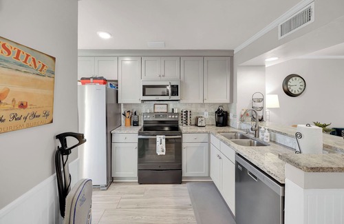 **Fully Equipped Kitchen** – Cook with ease in the fully stocked kitchen, featuring modern appliances, cookware, and a coffee maker.