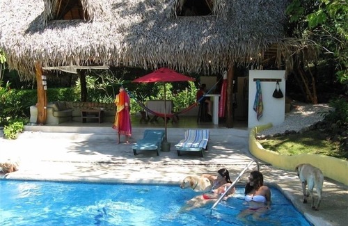 Rancho located next to the swimming pool. This is the heart of our home. All the action happens here.... family style dining on large handmade picnic table (pechote) that seats 10, large full sized kitchen with all amenities for cooking gourmet meals or baking! Great for entertaining. Large living area with couch, chair and ottoman. The hammock is my husband's favorite resting place amongst the action. Above the kitchen is the second bedroom/sleeping quarters. Sleeps 3/5 If needed (2 full sized beds, one single). The roof is the highlight of this structure... lined with cedar and topped with palm.