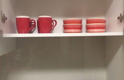 1 bedroom and 1.5 bathrooms, a living room, balcony and kitchen. Kitchen is stocked with essentials. Countertops in the kitchen and bathrooms are granite and hardwoods floors throughout the apartment. Double bed in the bedroom with nice view, large closet, and an in-suite bathroom with tub-shower combination. The bathroom is freshly stocked with soap, shampoo ad toilet paper for all guests.