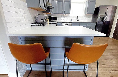 Inside, the fully remodeled house boasts a 3 bed 2 bathroom of wonderfully-appointed living space, featuring new flooring, an open floor plan, and large windows for tons of natural light. Kick back and relax, watching the options on the SMART TV beside the cozy electric fireplace in the living area while chatting with the chef of the group in the fully equipped kitchen, which includes stainless steel appliances, quartz counter-tops, and a large farm sink, enabling you to cook delicious homemade meals. Two of the comfortable bedrooms includes king-sized beds and the third room with a comfortable queen. In addition, the sectional sofa folds out into a queen bed.
