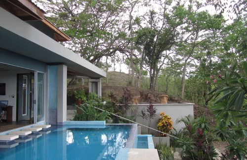 Very contemporary open art filled home, three bedrooms each with private indoor/outdoor bath offering beautiful views of both the ocean and mountains from high on a hill. A true experience of being in and surrounded by nature yet in bathed in elegance and art. The location of this property is enough out of town to offer total privacy and yet close enough to get to town and the beach quickly. The serenity is amazing, the views are magic! Due to being high on a hill, there is always a breeze and less mosquitos. The infinity pool invites you to laze or swim laps while you gaze at the ocean. You can literally walk into the pool from both the living room area as well as the master suite. The gourmet kitchen, with lots of amenities, including an ice cream maker, has sliding windows that open up to the mountains so when you are preparing food, you have wonderful views. The yoga deck/art/massage studio, on top is the crowning jewel! You feel like you are on top of the world with a 360 degree view of ocean and mountains and sky, nothing else besides lots of monkeys and birds! Our little family of monkeys traverse the property on a regular basis.You can spend hours watching them play. There are other decks to sun on or relax in the shade. The bedrooms all have private baths with outdoor/indoor showers. Art is integrated everywhere, including the owners light sculptures, architectural glass installations and paintings. The paintings are all for sale and the light sculptures are available for order. All of the furniture was designed by the owner and made specifically for the house. Schedule a massage on the yoga deck with several massage therapists in Samara, enjoy a glass of wine while you watch the monkeys or play in the pool.