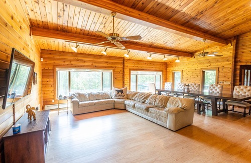 Family-friendly log cabin house with 5 bedrooms, 3.5 bathrooms, playroom, bar/billiards room, hot tub, playground, trampoline, den with pull-out couch/media entertainment center and exercise bike, fully-equipped kitchen, grill, outdoor dining patio with treetop views, 10-minute drive to Belleayre ski mountain and Bellayre beach! No pets allowed.