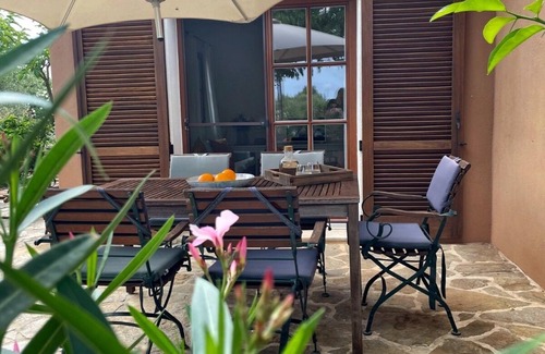The house is quietly located in the middle of nature and offers pure relaxation. The apartment has a living area with an open, fully equipped kitchen and high-quality gas stove, its own terrace with a large BBQ for a perfect barbecue evening, 1 bedroom with ensuite bathroom and king-size bed, 1 bedroom with queen-size bed, 1 additional bathroom and 1 Dining room.