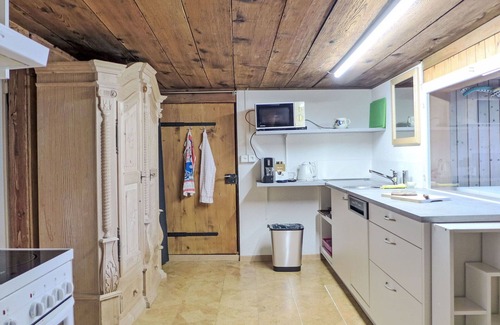 You can expect a 5-room chalet spread across two levels, featuring a spacious interior with sloping ceilings and cozy, simple furnishings. The ceiling height ranges from 180 to 190 cm, and the door height is 180 cm. The chalet comprises a living/sleeping room with a single bed (90 cm, length 200 cm), a Scandinavian wood stove, and a TV. It also includes a large room with a double bed (2 x 90 cm, length 200 cm), a small room with a single bed (90 cm, length 200 cm), an open living/dining area with a dining table, and an open kitchen. The kitchen is equipped with four ceramic glass hob hotplates, a toaster, kettle, microwave, electric coffee machine, capsules for the coffee machine (Delizio) available at an extra cost, a raclette grill, and a fondue set (cheese). It also features a wood-burning stove. The bathroom has a bath and toilet. On the lower ground floor, accessible via an exterior staircase, there is an additional room with a ceiling height of 170 to 185 cm and a double bed (2 x 90 cm, length 200 cm). The chalet has wooden floors throughout and a terrace with furniture, offering a marvelous panoramic view of the mountains and countryside.