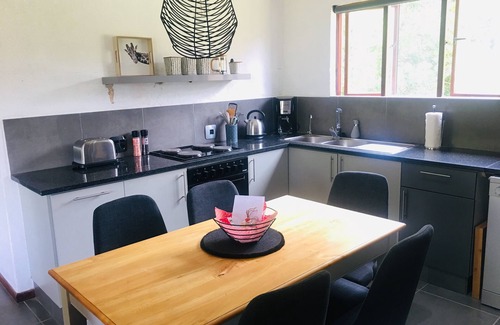 The chalet is part of the secure Greenway Woods Resort, right next to the White River Country Estate. It’s a home away from home with everything you need to make your stay comfortable, including a well-equipped kitchen with a dishwasher. The unit has two areas: one with a full bathroom plus a bathtub and two bedrooms—one double bedroom and a twin bedroom. The other area, still part of the whole unit, comprises an ensuite bathroom and a double bedroom. This area can be closed off with a door from the rest of the unit and has a separate entrance leading to a second veranda.