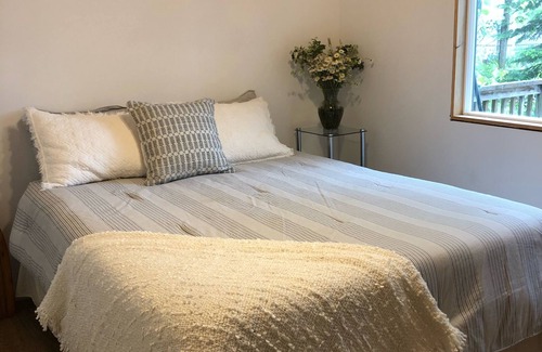 Included is an electric oven, toaster, toaster oven, microwave, fridge and dishwasher modern, all the kitchen supplies needed (dishes, utensils, pots & pans, kettle and coffee maker), Wi-Fi, TV with streaming services, fire pit with plenty of firewood, gas BBQ and just under an acre of unspoiled land and country roads to explore. For recreation, (seasonal) there are a couple of lawn games, and a slew board game and puzzles available for evening fun.
