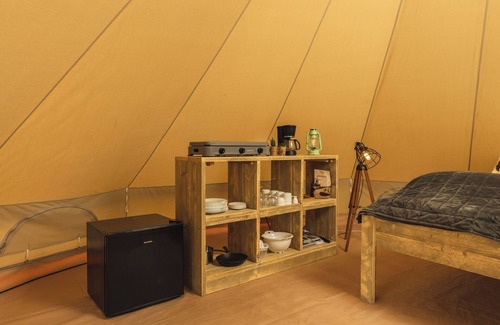 Stay in a Cozy Bell Tent at Our Charming Harbor!Experience a unique getaway in our delightful harbor tents, where comfort meets nature. These fully furnished bell tents are ready for your arrival—bring your suitcase! Enjoy the fresh outdoors with the luxury of home, featuring cozy beds, a side table with comfortable chairs, warm lighting, and a lovely outdoor space overlooking the harbor.Each tent includes a refrigerator, a gas stove, and private sanitary facilities right next to it. Relax outside and take in the serene harbor views. If you bring two children, they get their adorable tent beside yours! We’ll make up their beds for a comfortable stay. Need a cot for a little one? There's space for that in your tent, keeping them close by.Right behind the tents, a playground offers fun for the kids while you keep a watchful eye. Our Happy Harbor Tents are set on the edge of our lively pop-up glamping site, Bij de Buren. Here, you’ll find a vibrant festival vibe with twinkling lights, cozy campfire spots, and a fantastic pop-up restaurant. Nestled between the harbor and all the excitement, this is the best spot in the park!Kitchen Amenities:Nespresso machineRefrigeratorGas stoveKitchenware (kitchen linen available for booking)Come and unwind in this one-of-a-kind harbor retreat!