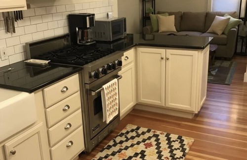 - full kitchen amenities with high-end appliances, including dishwasher, Viking gas range, oven, coffee maker, electric tea kettle, microwave Miele washer/dryer and more