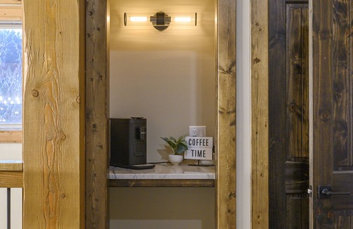 Entertainment options abound at Broken Branch Lodge. The main level game and media room is outfitted with a pool table, vintage arcade machine, a wet bar with fridge and icemaker, and an entire wall of HDTVs, so you never miss the big game. Upstairs, you’ll find a fitness and activity room complete with a Sole elliptical machine, Life Fitness bike, Bowflex dumbbells, and space for yoga or play. There's also a gaming TV, a cozy reading and conversation area with an electric fireplace, and a beverage station with undercounter refrigerator and 3-in-1 coffee and espresso maker. A workstation with barstools and outlets makes remote work or school easy and convenient.