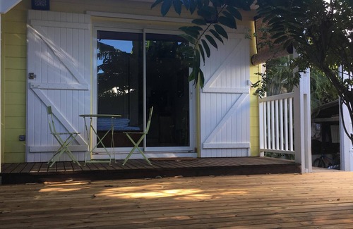 Beautiful bungalow of 27 m2 in Les Avirons, with kitchenette, near the Etang Salé beach, beautiful wooden terrace, swimming pool in tropical garden.