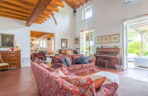 "Ca' del Vento", 7-room villa 450 m2 on 4 levels. Spacious, partly with sloping ceilings, comfortable and antique furnishings: open large living/dining room with open-hearth fireplace, dining table, satellite TV, radio, CD-player and hi-fi system. Exit to the terrace, pergola. Large kitchen (oven, dishwasher, 4 gas rings, toaster, kettle, freezer, grill, electric coffee machine, pizza oven) with small dining table. Exit to the garden. Sep. WC. Upper floor: open gallery with 1 bed. 1 room with sloping ceilings with 1 bed and air conditioning. 1 room with 2 beds, shower/WC and air conditioning. 2nd upper floor: 1 double bedroom with 1 french bed (160 cm), air conditioning. Bath/bidet/WC. 3nd upper floor: 1 double bedroom with sloping ceilings with 1 french bed (160 cm), air conditioning. 1 large double bedroom with sloping ceilings with 1 double bed and air conditioning. Shower/WC. Gas heating (extra). Parquet floors, natural stone floors. Small terrace, large terrace partly roofed. Terrace furniture, deck chairs (10), covered balcony, sitting area. Beautiful panoramic view of the valley and the countryside. Facilities: washing machine, iron, children's high chair, baby cot for up to 2 year olds, hair dryer, logs (free). Internet (WiFi, free). Please note: non-smoking house. Maximum 1 pet/ dog allowed. Private entrance. CIR: 018187-CNI-00002
