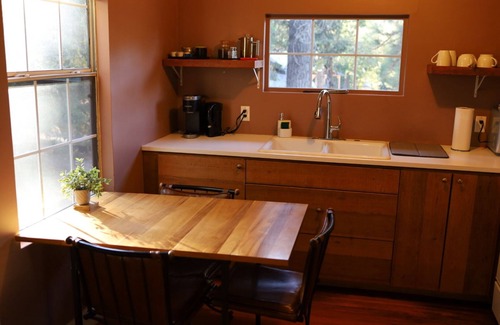 Modern elegance meets rustic charm in this beautifully reimagined Twin Peaks Cabin. Cabin 2 has a King bed in the larger bedroom and a set of bunk beds in the small bedroom. The beautiful living room has a couch and two cushy arm chairs and a large dining area. There's a full bathroom and small kitchen has all the basics you'll need. Pull right up to your cabin and park.