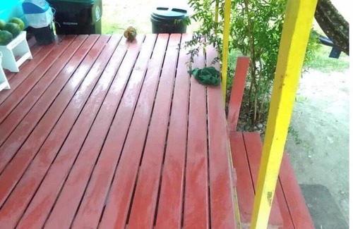 Shared chattel house with hot shower, toilet, sink, kitchenette, and covered deck