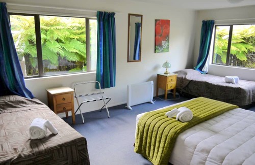 Our Three Bedroom Detached House is located in a private area, yet only 1 minutes walk from the centre of Franz Josef. The first bedroom offers a King bed, the second bedroom contains a Queen and Two Single beds, the third and smaller bedroom contains a single bed only. All beds are fitted with electric blankets. The house has 1 bathroom with separate toilet and a full kitchen. Free unlimited WIFI and on site parking is provided. The large lounge with heat pump is ideal for a group.