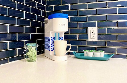 The kitchen is ready for guests to enjoy and comes fully equipped with a stainless-steel appliances including ull-size stove-oven combo, microwave, toaster, refrigerator, dishwasher and a Keurig coffee maker. Guests will find all of the amenities of home in this kitchen, including enough place settings for four and all of the cookware needed to experiment with those new dishes.