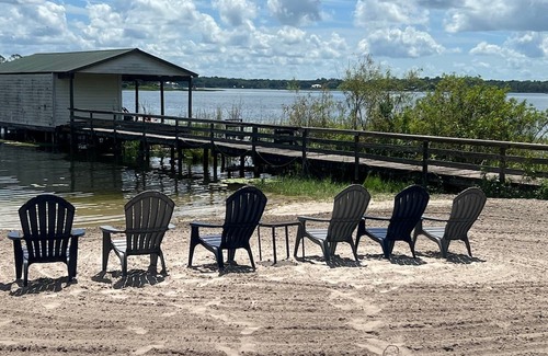 Relax with the whole family at this picturesque peaceful place to stay directly on Lake Weir. Freshly painted, new carpet, new furniture. Game room with air hockey, ping pong and video games. Take oversize Connect 4 and Corn Hole to the beach or your fenced in back yard. Complimentary private dock to accomadate your boat and large beach. Catch bass on your dock, your friends can jet ski to your beach to visit you. Three lakefront restaurants, Eaton's Beach, Cafe Lucia (on Lake Bobby Weir) and Gator Joe's all with boat access. Gated private driveway with plenty of parking for cars, boat trailer, camper. Just a 10 -15 min drive to all Villages shopping and activities. Perfect for your winter home away from home. Ocala, home to even more shopping and restaurants, and the World Equestrian Center is less than 20 miles away. Plenty to do on and off the lake.