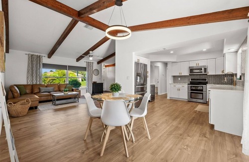 Welcome to Your Poolside Oasis! This bright and modern 2-bedroom, 2-bathroom home features an open-concept living space with vaulted ceilings and stylish wood beams. Relax in the living area,cook in the fully equipped kitchen, or enjoy meals in the dining nook. The primary suite boasts a cozy retreat with plenty of natural light. Step outside to your private screened-in pool and lounge area – perfect for soaking up the sun or unwinding. Located in a quiet neighborhood close to local attractions! Heated pool additionally 25$ per night
