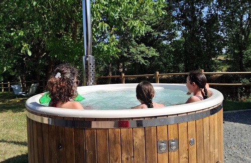 Terrace in front of the living room - Nordic hot tub for 6/8 people (all year round) - Weber charcoal barbecue - chairs and dining table, deckchairs.