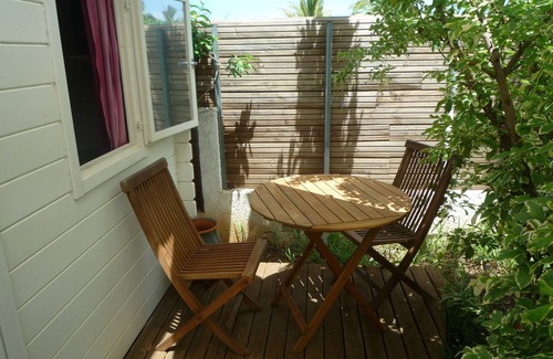 This bungalow has a TV, wi-fi connection, a bathroom (shower and w-c) and a kitchenette opening onto a small shaded terrace. It is designed to accommodate two people (double bed).