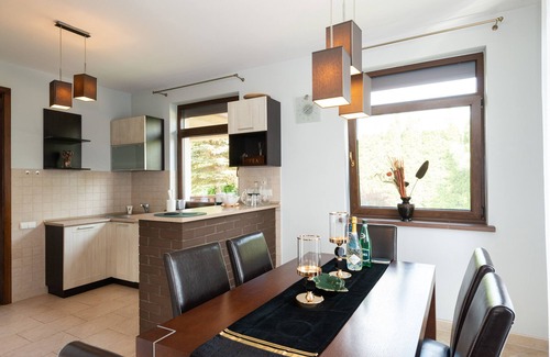The house is situated on a large plot of land in Gdów near Krakow. This location provides our guests with peace and privacy. The house has 4 bedrooms with double beds, 3 bathrooms, a fully equipped kitchen with coffee machine, microwave, dining room and living room. There is also a spa area waiting for our guests, where they can relax in a comfortable jacuzzi and a dry sauna. There is a gazebo in the garden where you can spend time pleasantly and prepare a barbecue. In the garden our guests can also find great outside hot tub (paid additionally 350 PLN for whole stay)