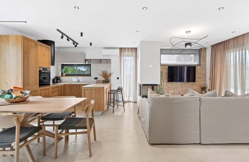 This modern, fully air-conditioned villa offers everything you need for an unforgettable vacation. Two tastefully decorated bedrooms with en suite bathrooms are at your disposal. The open space concept of the main floor is decorated in light shades and provides enough space for complete relaxation and enjoyment for the entire group. The modern kitchen is equipped with everything you might need to prepare delicious meals, which you can serve at the spacious dining table. The comfortable living room with wide sliding doors provides enough light for undisturbed relaxation under the air conditioning. The villa also features a modern sauna.