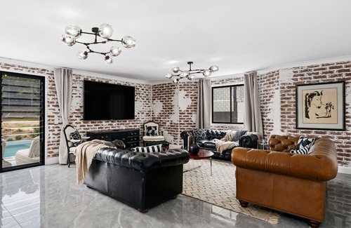 With its laid-back charm and refined interiors, Chateau On Cudgen impresses with a combined living, dining, and kitchen space that opens up to a stunning north-facing deck that overlooks the rolling hills, and is complete with a swimming pool, outdoor lounge and dining area.