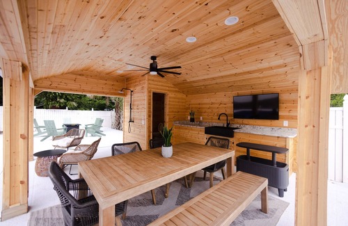 Escape to this stunning urban oasis with a resort-style cabana! This spacious, beautifully modernized 1938 bungalow offers both charm and convenience. Step outside to a private retreat with an in-ground pool, putt-putt, fire pit, and cabana featuring a smart TV, half bath, and dining space. Nestled in a vibrant neighborhood, you’re just a stroll away from local coffee shops, dining, bars, and CrossFit. Experience the perfect blend of relaxation and walkable city life at this peaceful getaway.