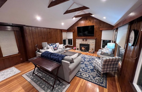 3 bedroom/2 full bathroom cabin located on the north side of Bohners Lake in Burlington, WI. Living room hosts vaulted ceilings with 75" 4K television, pull-out sofa bed, wood burning fireplace, and fantastic views of lake. Master bedroom on first floor with his/her closets and ceiling fan. Plenty of cabinetry in kitchen with stainless steel look refrigerator, electric oven/range, and dishwasher. Game room located in walk-out basement complete with foosball, video pinball table, dartboard, and chess. Four seasons room hosts gas fireplace, plenty of board games, 65" television, pull out child bed, and electronic recliners while providing beautiful views of lake. 2nd and 3rd bedrooms located on 2nd floor and provide plenty of bedding for families. Laundry located in basement area as well under secure access. Minutes from bike trails and downtown Burlington, WI and a short drive to Alpine Valley Ski Resort and Lake Geneva, WI.