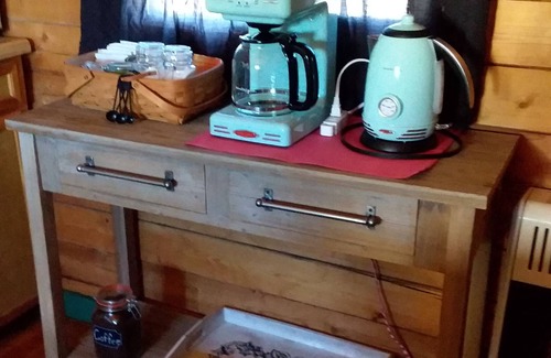 The main room has a nice sitting area and kitchen area. There is a small refrigerator, electric stove with oven, microwave, and coffee/tea/hot chocolate bar for your convenience. Enjoy your meal inside or sitting on the porch, either on the two persons swing or bistro area.