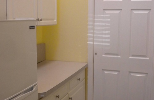 This spacious studio apartment has wood flooring and an area rug it offers a queen size bed, glass top eating table with 2 chairs and a designer chair for your seating comfort. There are two closets with hangers, a wall unit with additional draw space. The kitchen with its tile flooring and vaulted ceiling, is equipped with a microwave oven, Toaster/convection oven and a induction plate. Also, for your morning coffee is a coffee maker in addition to a blender for your fruit smoothies. Plenty of dishes, cups, spoons and forks are provided for your convenience.