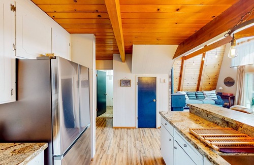The Cozy Cabin's curb appeal will instantly draw you in. Carefully built, this farmhouse-style cabin showcases an open floor plan and 20+ foot vaulted ceilings. As you enter through the front door, you will take notice of the spacious main room's gambrel knotty pine ceilings, wood-burning stove, and comfortable furnishings. The room's wall of windows provides a steady stream of natural light to flow in. Making cooking a breeze, the full kitchen is fully updated with new appliances and gleaming granite countertops.