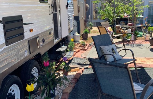 Our cozy, classy RV is minutes from beautiful downtown San Diego, PETCO Park, Seaport Village, The Gaslamp, Balboa Park, the San Diego Zoo, beach cities and many more scenic attractions. Your cozy stay is parked in the rear of our property equipped with a full shower/small combo, kitchen, refrigerator, with freezer, a propane generated stove and oven plus microwave. There’s a dIning table that seats 6 while 2 additional guests can use TV trays provided in the living space for expanded dining optional. The common living space has a 45 inch smart TV while the master bedroom has a queen bed with 2 sliding door for privacy, two small wardrobe closets, on each side of the bed with a 40 inch smart TV.