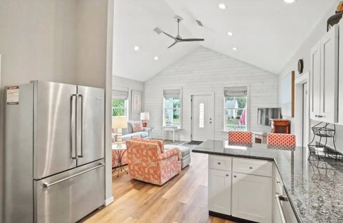 Welcome to your perfect beach-town escape! This charming 1-bedroom, 2-bath cottage retreat is nestled in a quiet coastal neighborhood, just a short stroll to both the bay and the Gulf shores. With a quaint, cottage-style exterior and covered front porch, it exudes laid-back coastal charm from the moment you arrive.