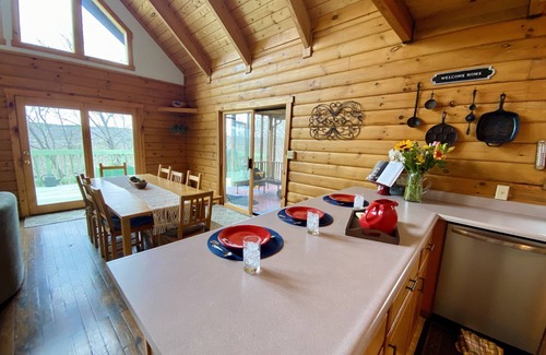Welcome to Creekview Cabin-the perfect retreat for your family and friends! Relax in a log cabin and cozy up to the gas fireplace after enjoying 4 acres of private woods with a creek, a wrap around deck, and screened in porch. Make memories in the spacious game room basement fitted with a full pool table, ping pong table, and media room. Prepare a meal for the whole family in the brand new kitchen or soak in the romantic jacuzzi tub made for two. Hosted by Super Hosts, Heidi & Dustin.
