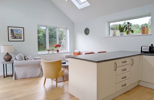 Entering the house there is a double bedroom with a separate shower room. There is a sitting room with lots of comfortable seating, a large smart TV and lots of books for guests to cosy up in the evening and browse. Back in to the main hallway and into the fabulous family space with the dining room kitchen and a lovely sitting area. The dining table has seating for 8 guests where you can sit and enjoy the culinary delights you have whipped up in the kitchen or why not try one of the wonderful local takeaways. There are bi-fold doors to off the dining room in to the patio and garden.