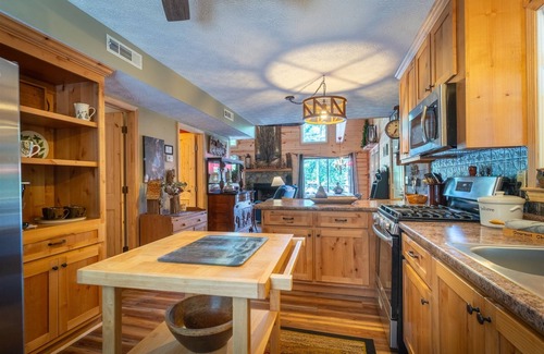 As soon as you pull into the driveway, the sound of the swift moving Town Creek reaches your ears. Let the water carry away all your cares during your stay at Creekside Oasis. Bring your fishing poles and try your luck at catching the big one! The newly renovated kitchen features all full size appliances, a Keurig coffee maker, microwave and dishwasher. The cupboards are filled with all the dinnerware, cookware and utensils you will need to eat any meal at the cabin. While the dining table seats six people and the kitchen counter seats an additional three people. The living room not only has a soft comfy sofa, but there are two leather recliners just next to the remote controlled gas fireplace. Sit back and relax!