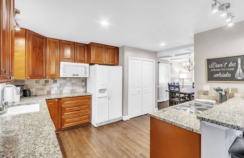 This pet-friendly house has a spacious, comfortable living area and a fully-fenced-in backyard with a beautiful deck, swings, and even a firepit! It’s the perfect spot for a relaxing getaway, family trip, visiting loved ones in the area, or long-term stays.