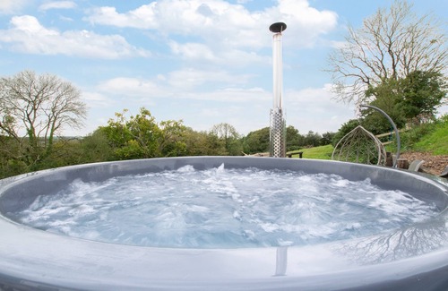 Outside: Patio area with hot tub and garden furniture. Grassy lawn and Gas BBQ.