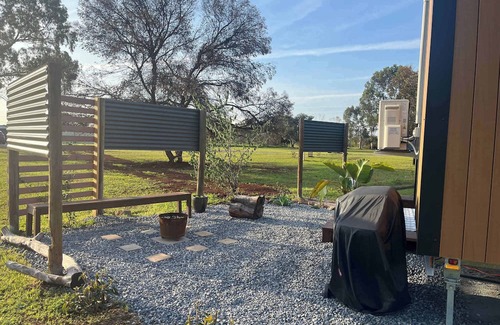 A cozy 139-square-foot tiny home with mains water, split air conditioning, a fully equipped kitchenette with a single-burner cooker top, toaster, Espresso coffee pod machine, and microwave. The bathroom comprises a full-size, gas-heated shower, with a hand basin and soft white towels provided for your stay. A perfect choice for a cute yet simple, relaxing holiday home for two.